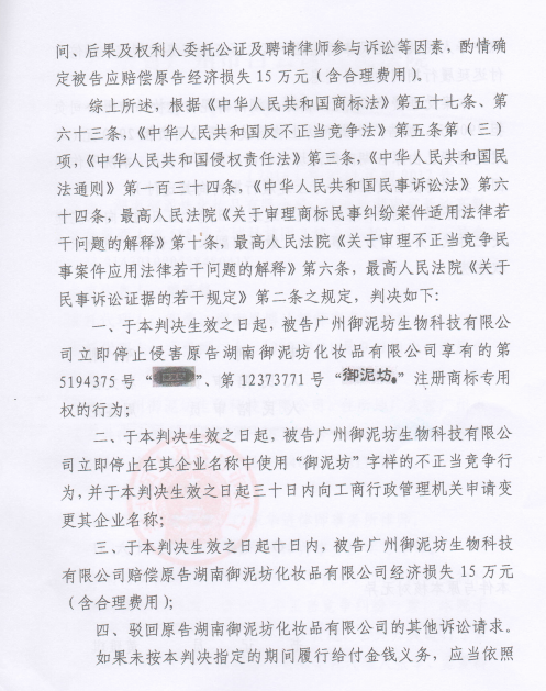 3、被告广州御泥坊赔偿原告湖南御泥坊15万元。