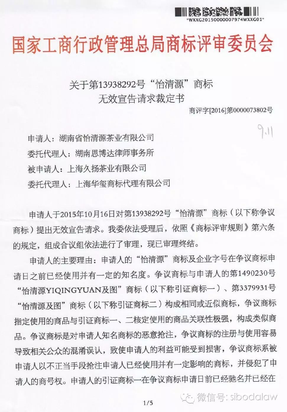 近日,国家工商行政管理总局商标评审委员会就我所代理湖南省怡清源茶业有限公司(简称怡清源公司)针对上海久扬茶业有限公司(简称久扬公司)在第11类“电煮茶机”等商品上注册的第13938292号“怡清源”注册商标提出的无效宣告请求作出裁定:上述“怡清源”商标被宣告无效!
