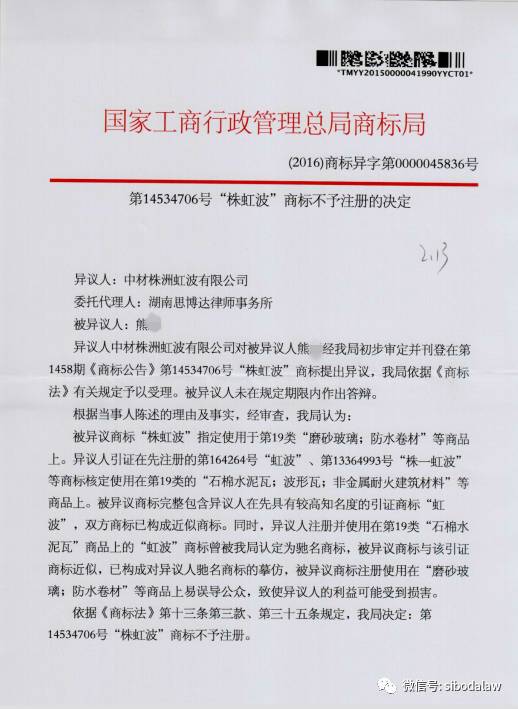 我所受中材株洲虹波有限公司(以下简称中材株波公司)的委托,针对熊某初步审定在第19类“防水卷材,磨沙玻璃”商品上的第14534706号“株虹波”商标提出异议。近期,国家工商总局商标局作出决定,以该被异议商标构成对异议人“虹波”驰名商标的摹仿,违反了《商标法》第十三条第三款规定为由,对该商标不予注册。