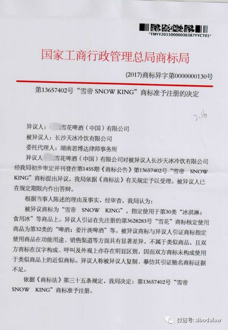 ”商标。在商标公告期内,该商标被某雪花啤酒(中国)有限公司(以下简称“雪花啤酒”)提出异议,针对雪花啤酒的异议我们进行了积极答辩。近期,国家工商总局商标局作出决定,以该被异议商标与异议人的引证商标“雪花 ”未构成使用在类似商品上的近似商标,同时异议人称被异议人复制、摹仿其引证驰名商标证据不足,对第13657402号“”准予注册。