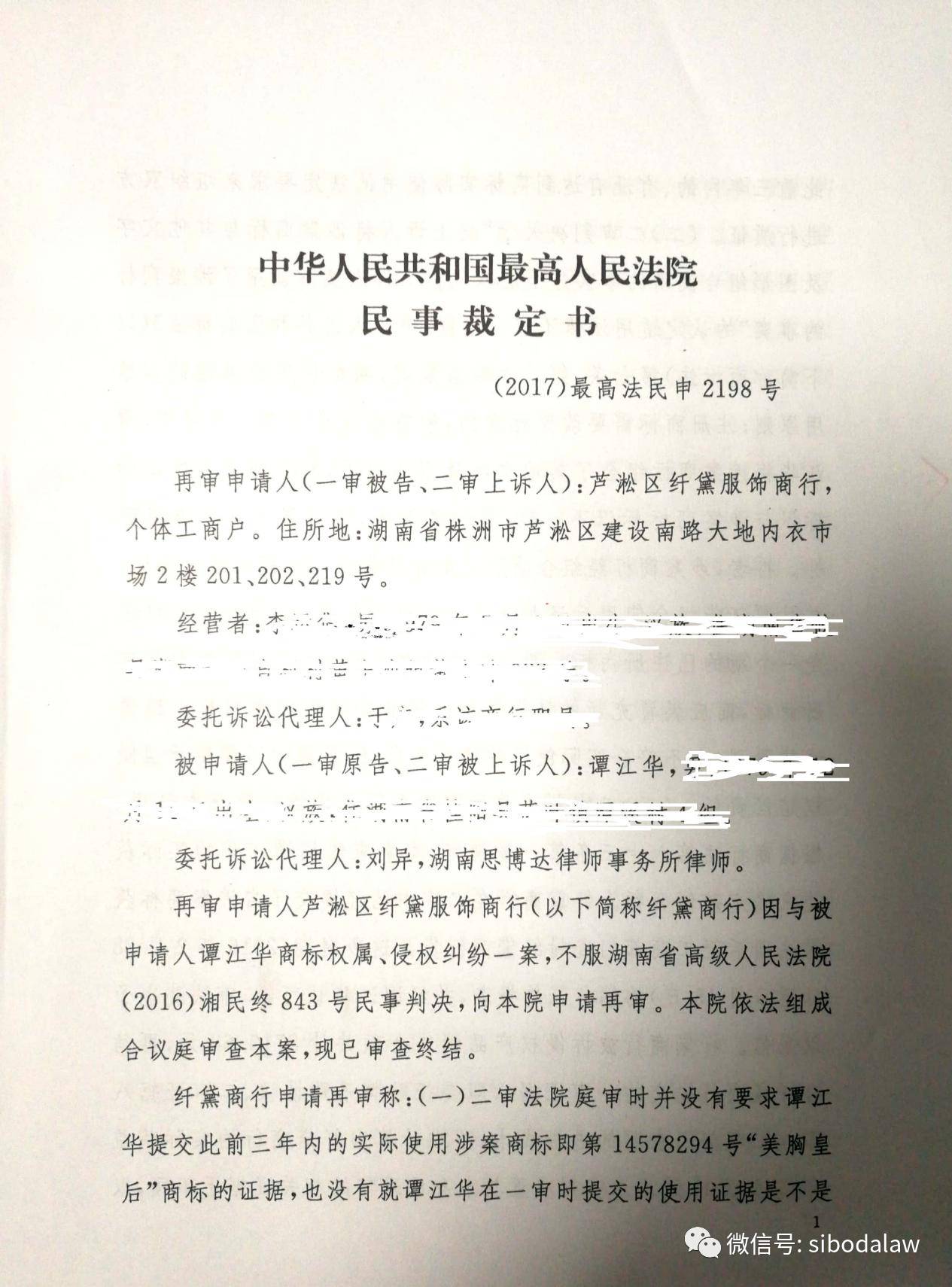 日前,最高人民法院就我所代理的“美胸皇后”诉“美波皇后”商标侵权案做出最终裁定,驳回了“美波皇后”提出的再审申请,维持了株洲市中级人民法院、湖南省高级人民法院先后做出的判决,认定“美波皇后”商标构成侵权,并应承担4万元赔偿责任。